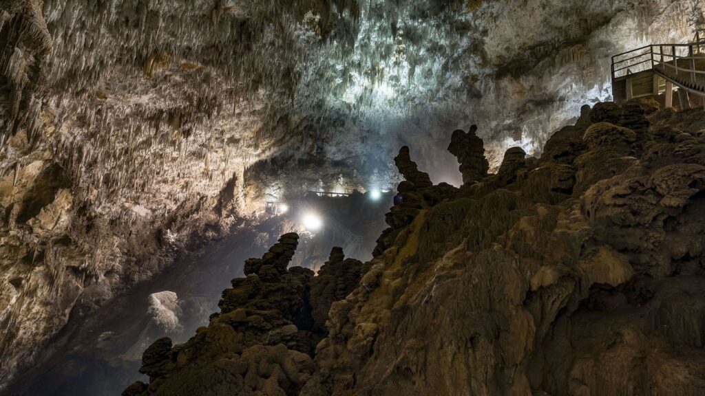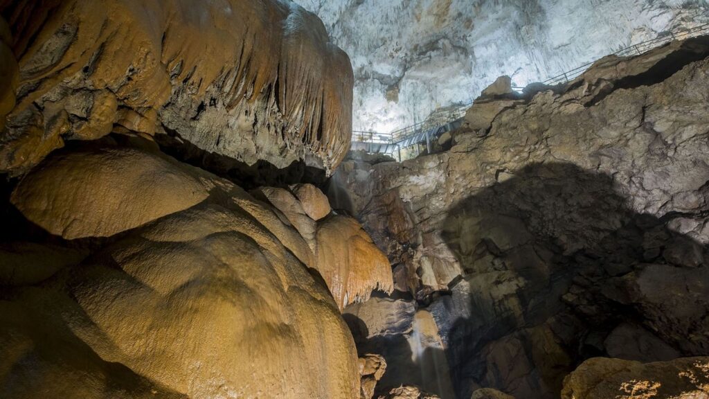 Salonda iki gelişim dönemine ait fosil ve genç damlataş şekilleri bulunmaktadır. Salonun ortasında Aksu Çayı’ndan gelen derenin oluşturduğu küçük bir şelale ve ikinci evreye ait bir kanyon-vadi bulunmaktadır ve ilk oluştuğu bölümden 17 metre gittikçe artan bir derinliktedir. Melen Çayı tarafından derince yarılmış plato karakterinde bir düzlüğün üzerinde düden konumunda bulunan mağara, yakın çevresinin yüzey sularını toplayarak Aksu Mağarası ile Melen Çayı’na boşaltmaktadır.
